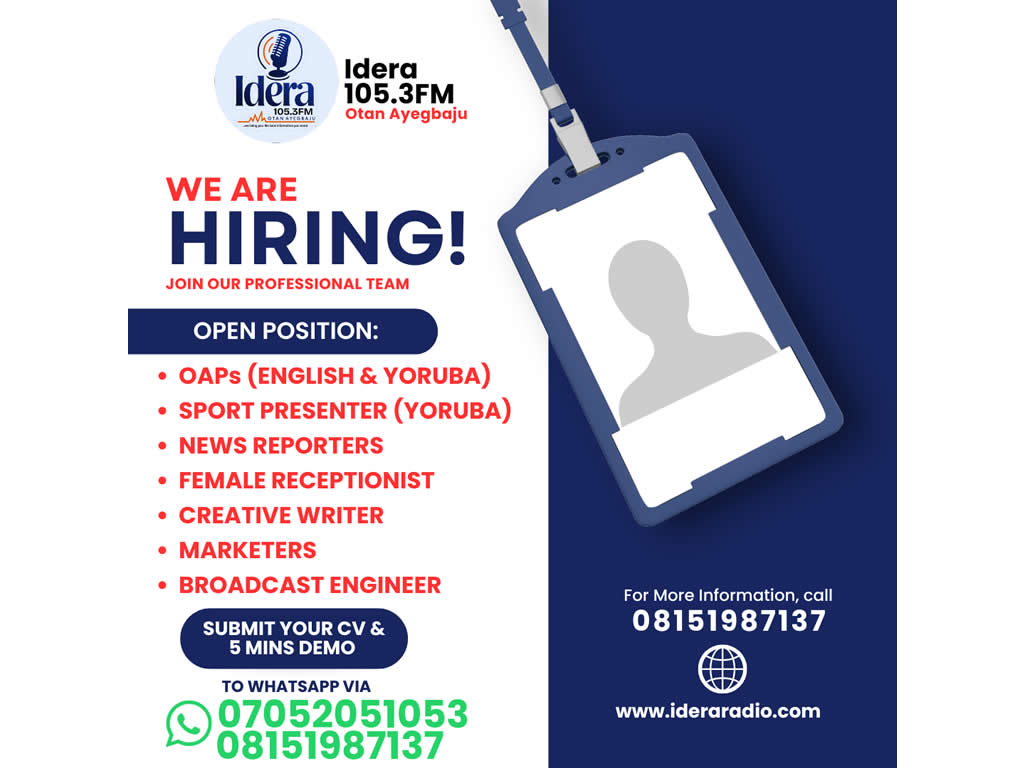 If you think you are qualified for any of the positions, kindly send your latest CV and 5mins Demo (MP3 Format) to 07052051053 or 08151987137