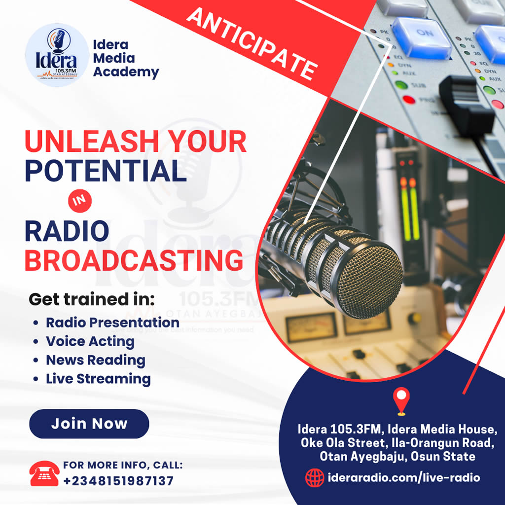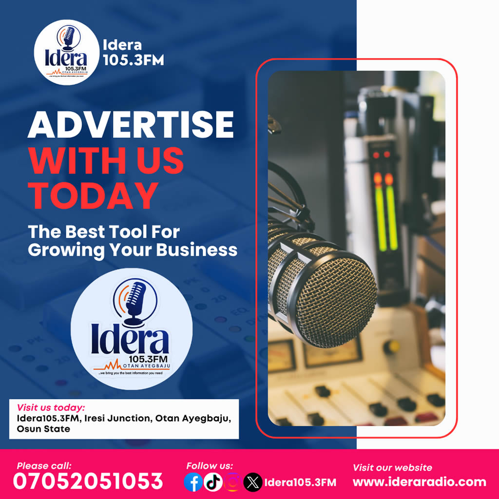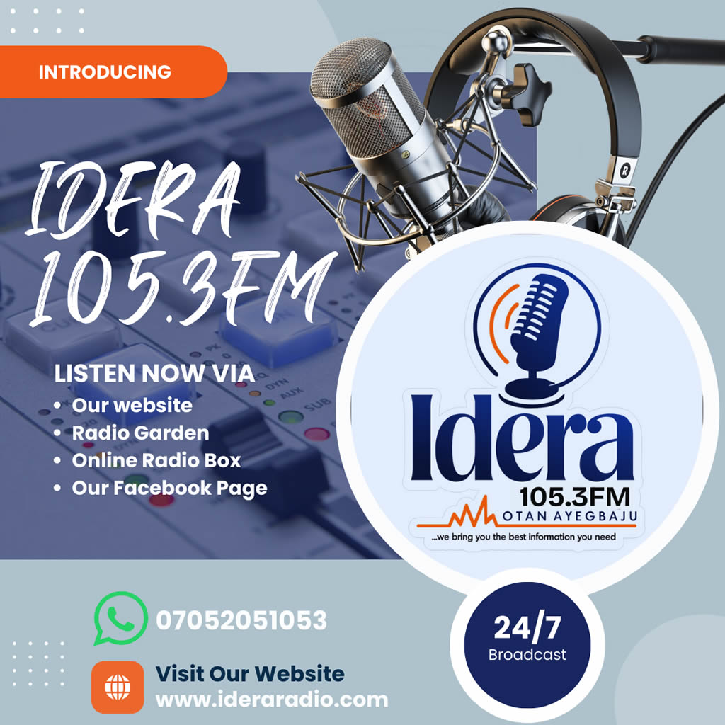 Idera 105.3FM, Otan Ayegbaju. Your Ultimate Radio Experience! Tune in for the best in music, news, and entertainment, all wrapped up in one exciting package! Whether you're at home, at work, or on the go, we bring you the best hits! Stay tuned.